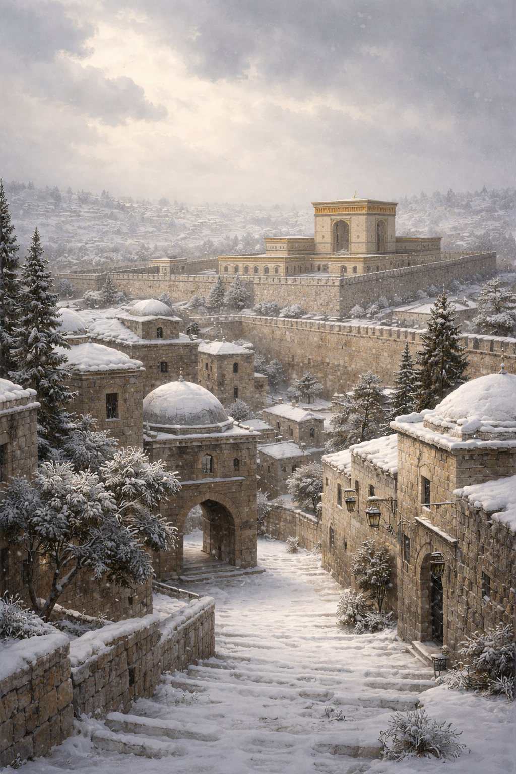 De koning kende de sneeuw wellicht ook vanuit Jeruzalem. Gemiddeld één keer per decennium valt daar sneeuw, in de stad die het hart van de wereld vormt. Dan bedekt zij straten en pleinen. Dan komt het openbare leven tot stilstand. Kinderen trekken naar buiten om sneeuwpoppen te maken. Het wordt een dag van bijzondere vreugde.