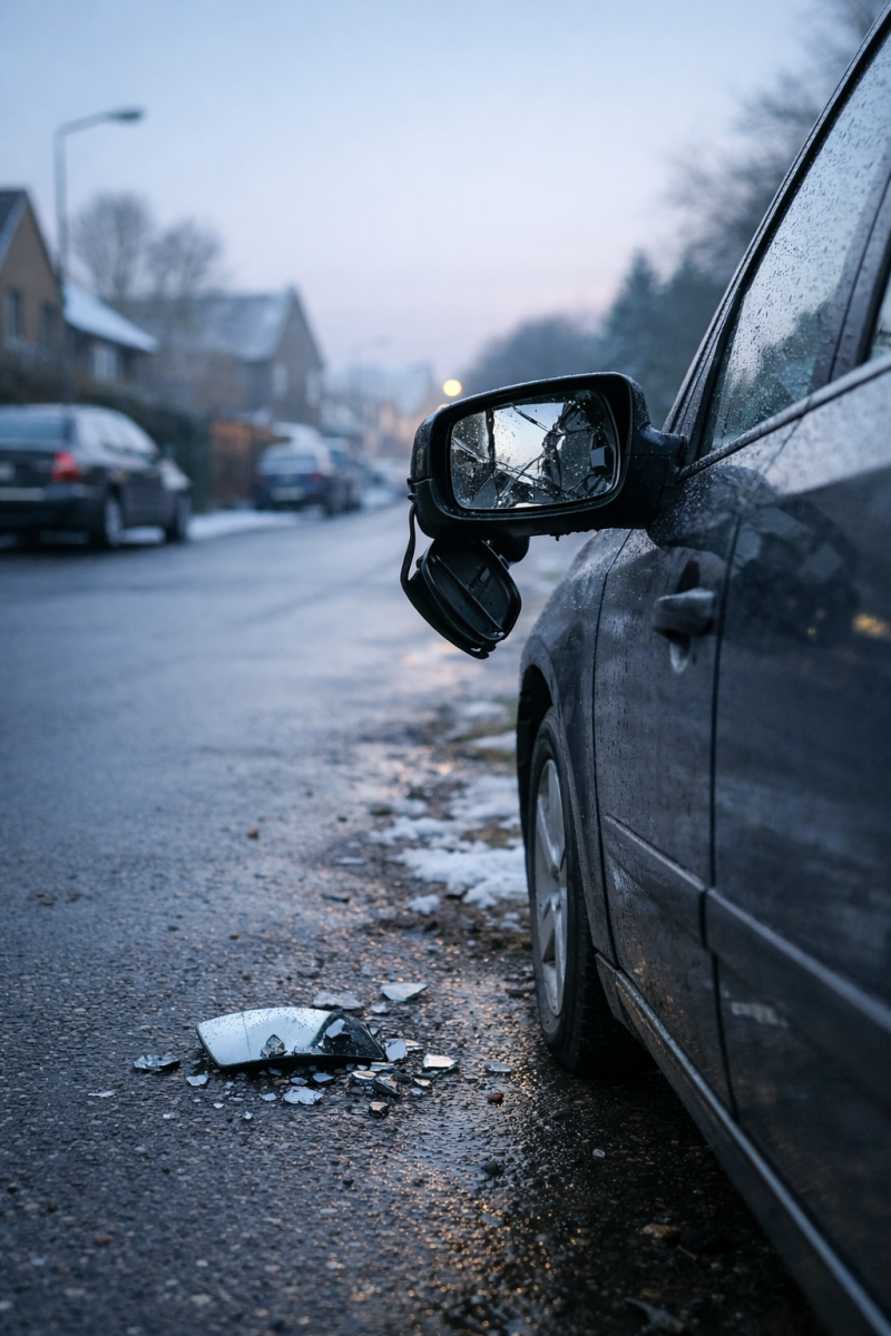Eenmaal bij de voor mijn woning geparkeerde auto aangekomen, weet ik in één oogopslag: ik zal de kerkdienst deze morgen niet in levenden lijve bezoeken. Aan de linkerzijde van mijn auto hangt een zwart stukje plastic, op de plek waar ooit een spiegel bevestigd was. Treurig bungelt het naar beneden, alsof het mij vertelt: ik heb de strijd van de nacht niet overleefd. Jij, chauffeur, staat misschien nog overeind na een korte nacht, maar voor mij was het een lange. Ik ben aangevallen en verminkt. Ik kan deze morgen niet verder.